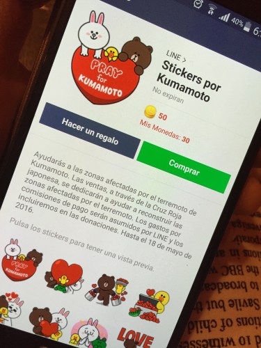 Puede que muchos de ustedes no utilicen esta aplicación tan seguido (ya que no es tan popular en latinoamérica aún), pero si es que está en sus posibilidades apoyar, quisiera invitarlos a colaborar con la causa comprando este set de stickers, créanme… muchas familias se lo agradecerán. Aunque Japón parezca un país lejano, en la ciudad de Kumamoto he conocido mexicanos, guatemaltecos, argentinos, etc. (es más, me he enterado de esta forma de donar gracias a todos los latinos en Japón!). Sólo quisiera que recuerden que este es un momento de suma urgencia y en situaciones como esta… toda ayuda cuenta. Además, Line cuenta con el programa «Monedas Gratis» los cuales pueden obtener a través de sus juegos (también gratuitos), lo que… en otras palabras significa que podrían hasta efectuar la compra de manera gratuita.